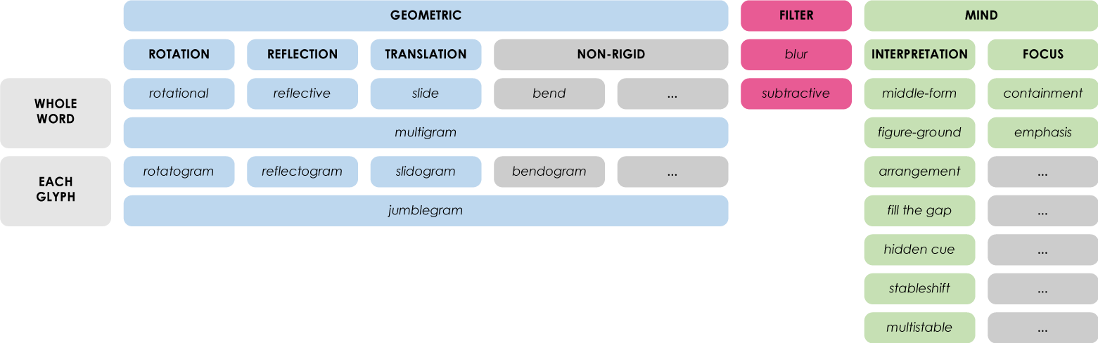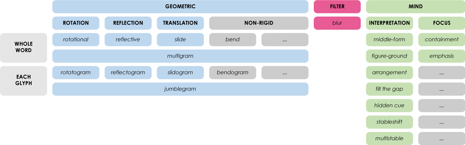 The “something happens” part is a transformation and it constitutes the typology of the ambigram. There are three categories of ambigrams: geometric, mind and filter.